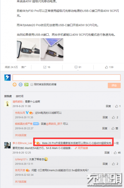 当时在这篇文章下面有一位名为“李小龙Bruce_Lee”的网友评论了一句:Mate 20 Pro升级到最新版本后就可以用支持5A E-Marker的C-C线握手40W超级快充。相信关注华为动态的朋友很熟悉,作为华为手机产品线副总裁的李小龙解答了之后,我们马上付诸实行。