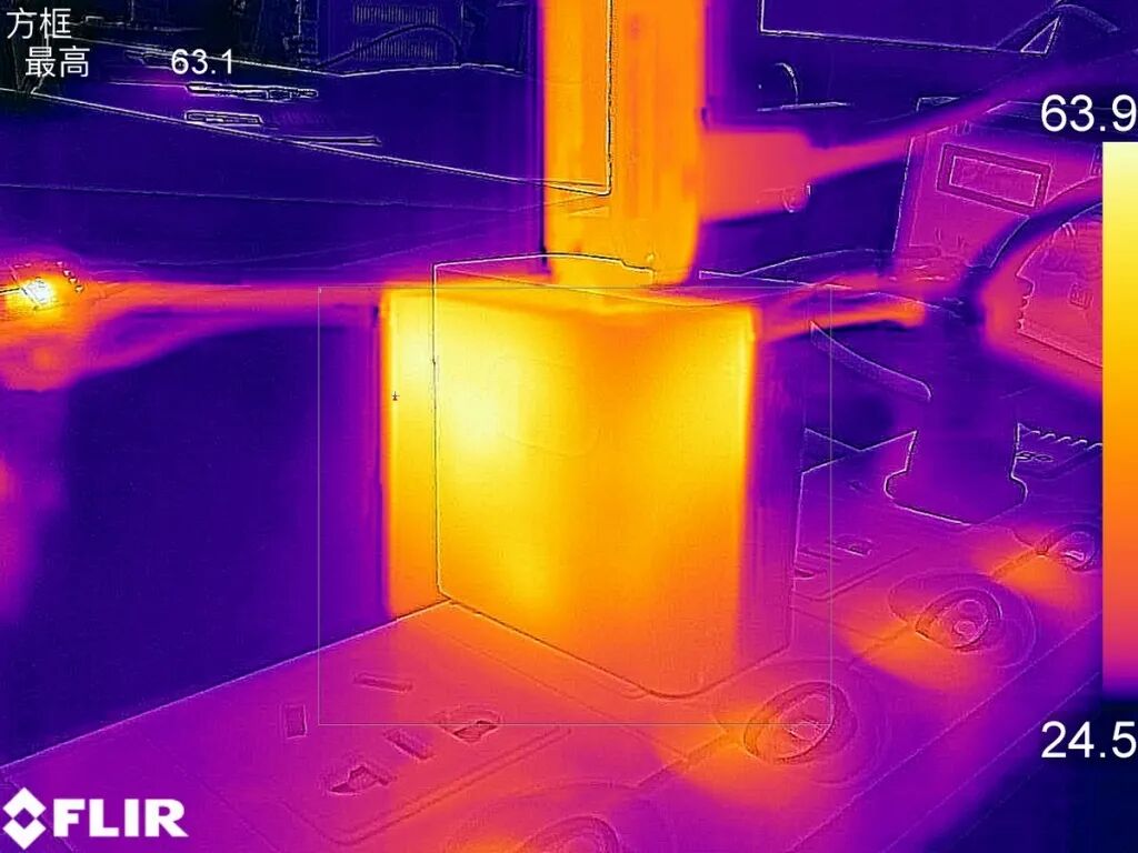 华为超级快充多协议充电器官方宣传页面里有一个介绍,充电器内部带有智能温控芯片,可以在温度过热时调整输出功率,控制温度。来看看实际表现,按照20V3.25A 65W进行满载测试,半小时后使用FLIR热成像仪记录温度,室温25度的情况下,充电器A面温度为63.1度。