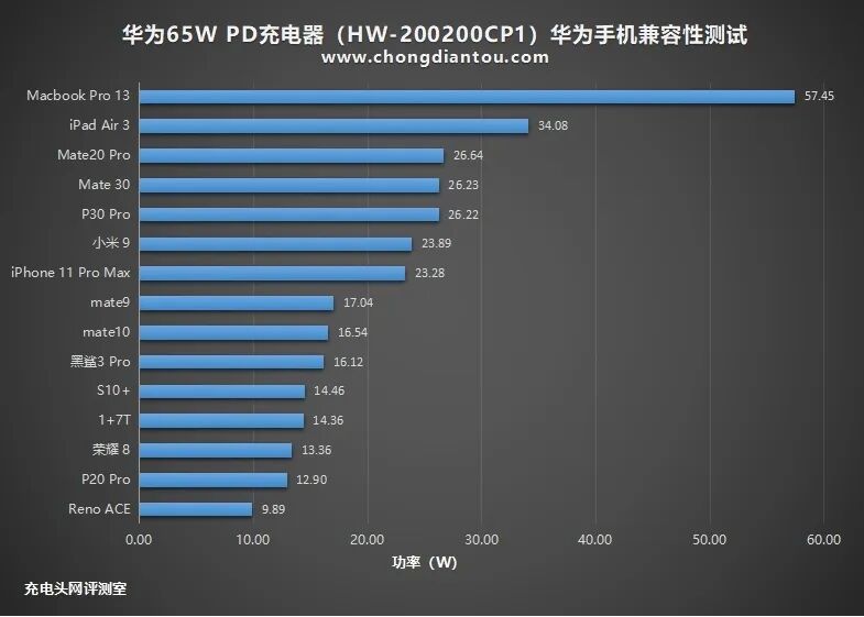 将功率数据汇集成柱状图,Macbook Pro13笔记本功率最高达到57W,iPad Air3 功率达到34W。后面几台支持40W SCP的华为手机功率都在26W左右,握手PPS快充的小米9与握手PD快充的iPhone 11 Pro Max功率在23W左右。