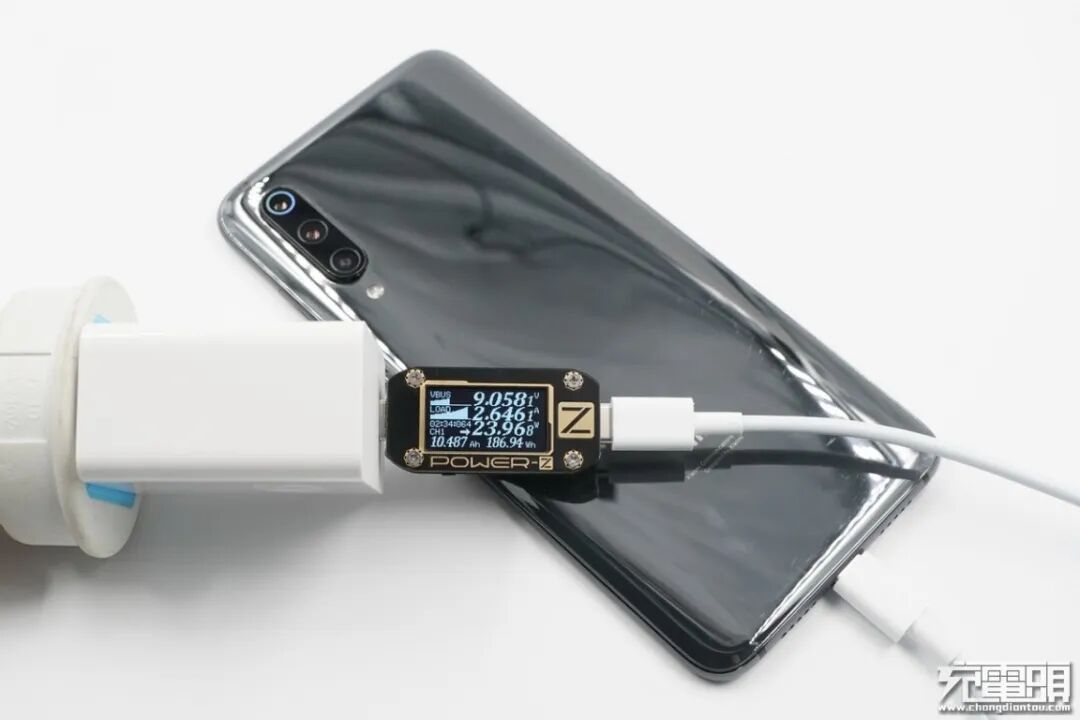 小米9支持USB PD / QC / PPS快速充电协议,使用USB-C对小米9充电,功率为9.05V 2.64A 23.96W,成功握手PPS快速充电协议,并达到PPS快充功率最大值。