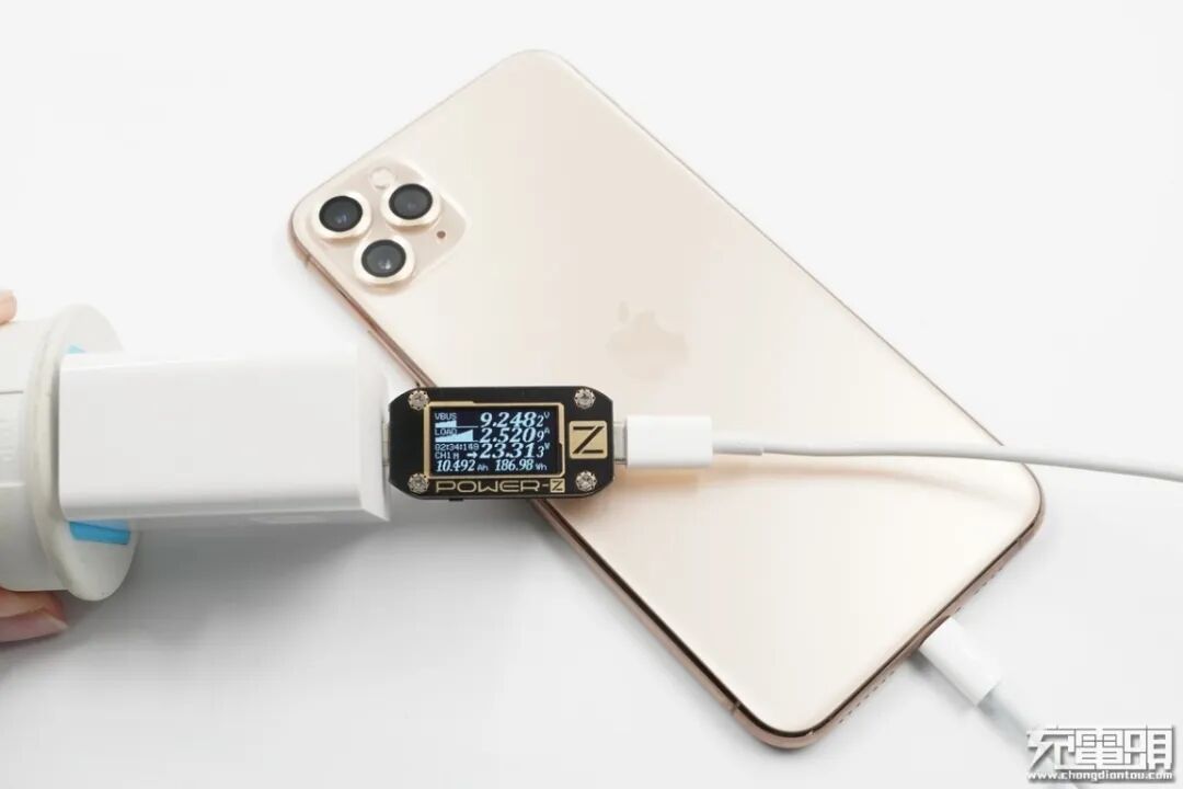 iPhone11 Pro Max支持USB PD和Apple2.4A快速充电协议,使用USB-C为iPhone11 Pro Max充电,功率为9.24V 2.52A 23.31W,成功握手USB PD快充,并达到USB PD快充功率最大阶段。