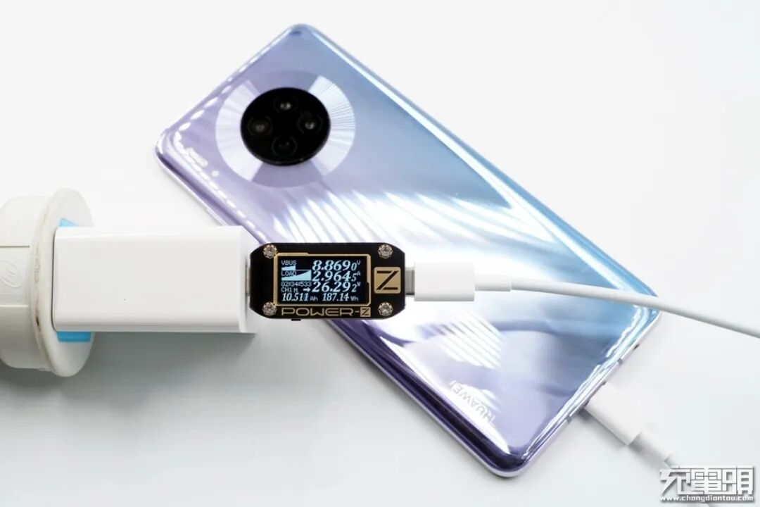 华为Mate30支持USB PD / FCP / SCP / 40W SCP快速充电协议,使用USB-C对Mate30充电,功率为8.86V 2.96A 26.29W,成功握手40W SCP快速充电协议,运行在10V3A 30W功率。