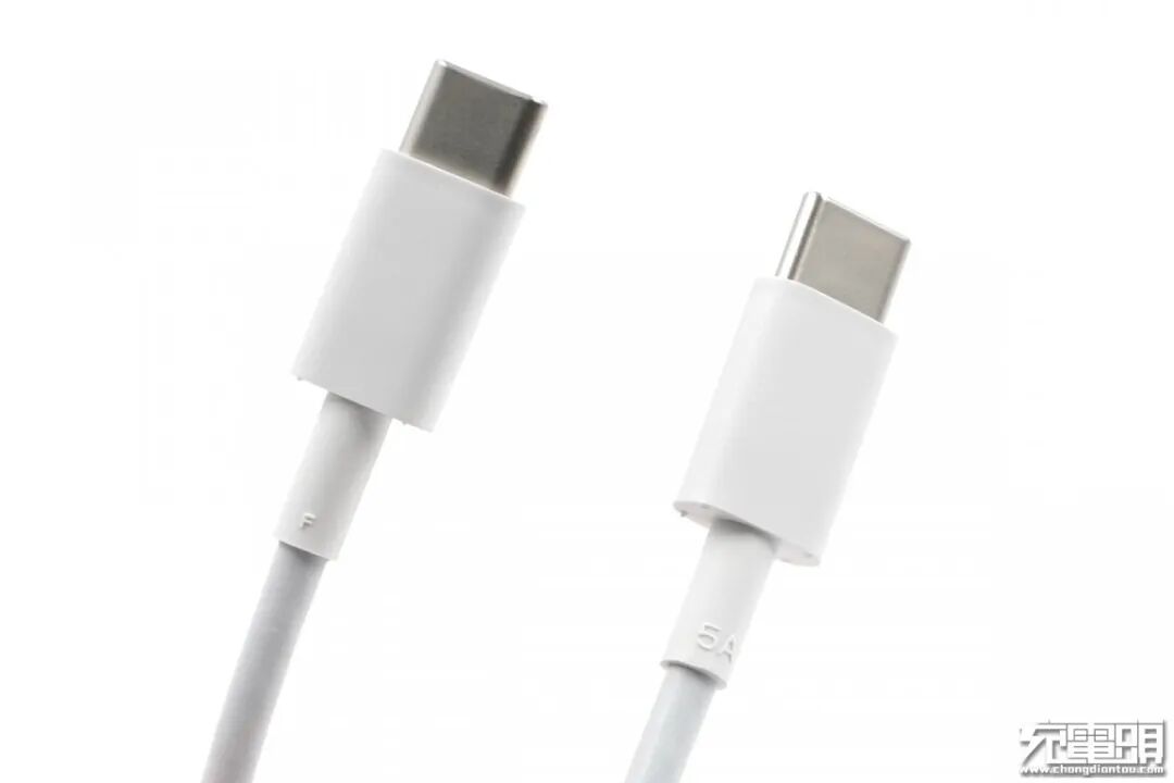 华为超级快充多协议充电器包装内搭配了一根USB-C to USB-C数据线,网尾上可以看到5A字眼,支持大电流通过。