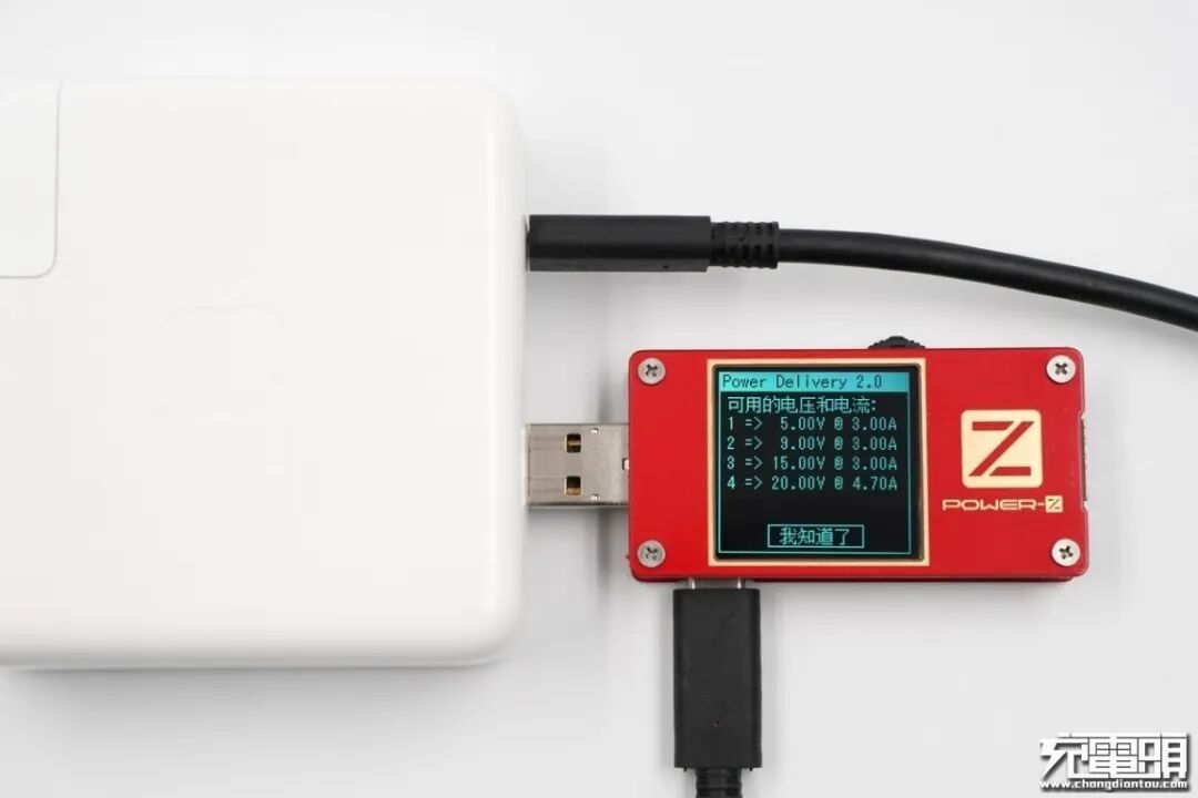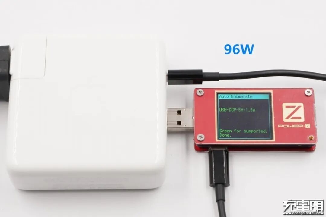 使用ChargerLAB POWER-Z KT001检测USB-C口的输出协议,除了DCP协议(5V1.5A短接识别)外,并不支持其他常见的快充协议,可以看出苹果96W充电器为纯USB PD快速充电器。