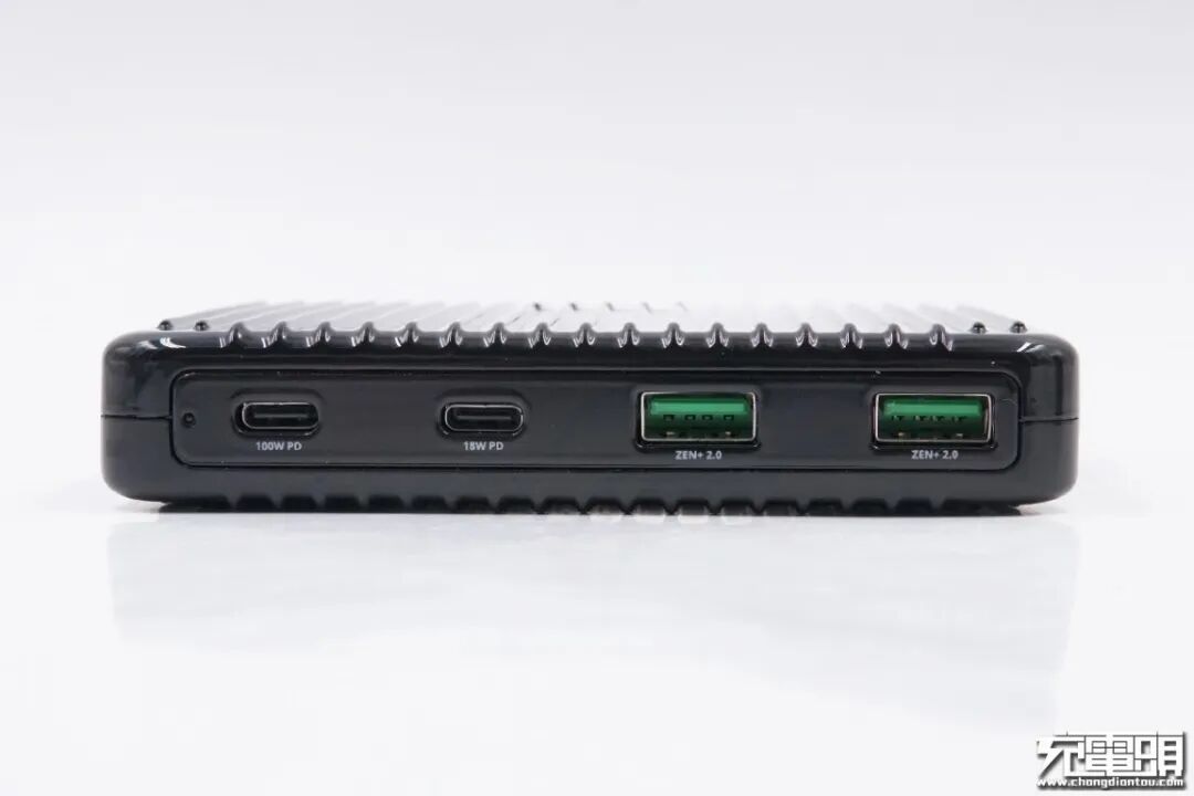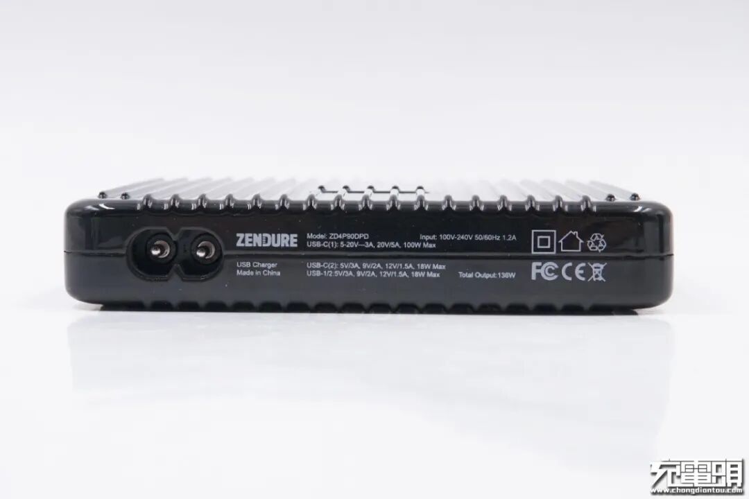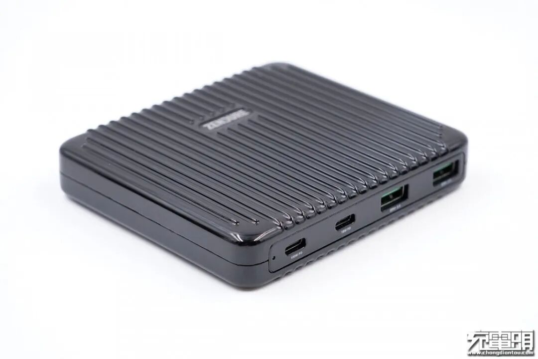 ZENDURE SuperPort 4充电器是一款桌面充电器,采用扁平设计放在桌面上比较稳定。外壳为工程塑料材质,表面钢琴烤漆处理十分光滑,壳体突出的竖条纹理是Zendure经典的旅行箱ID设计。