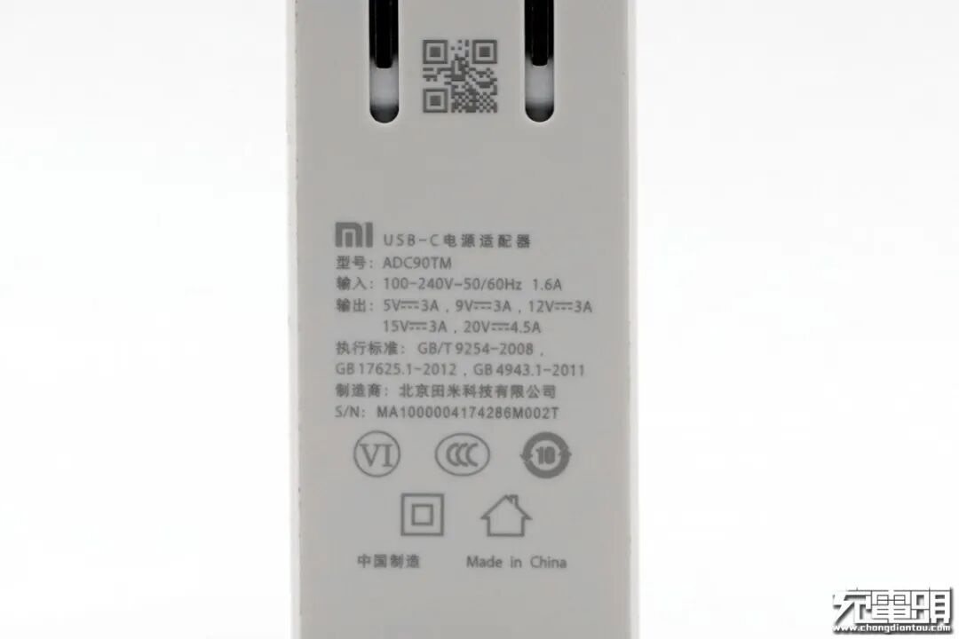 我们来看下小米90W PD充电器的具体相关参数,型号:ADC90TM;输入:100-240V~50/60Hz 1.6A;输出:5V/3A、9V/3A、12V/3A、15V/3A、20V/4.5A;制造商:北京田米科技有限公司,北京田米科技有限公司是小米笔记本电脑的生态链公司。