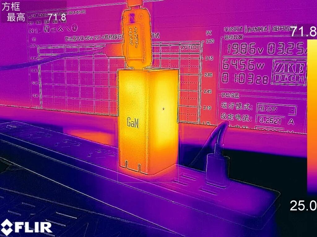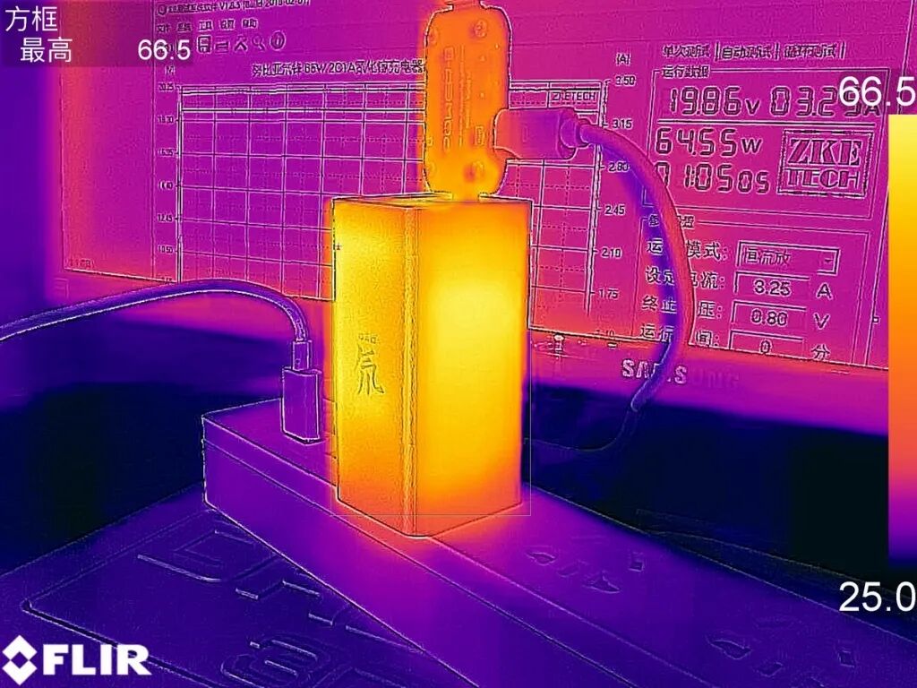 按照努比亚氮化镓充电器标称的65W最大功率进行带载测试,测试环境温度为25度,一小时后使用FLIR热成像仪记录温度数据。努比亚氮化镓充电器A面最热处温度为66.5度,温升41.5度。