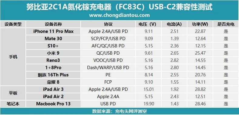受限于最大输出功率为30W,在对iPad Air3、Macbook Pro充电时功率约为28W,大功率设备尽量使用USB-C1进行充电,对于其他中低功率设备,充电性能与USB-C1相同。