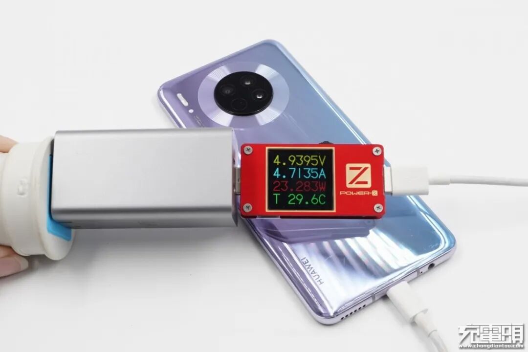 华为Mate30支持USB PD / FCP / SCP / 40WSCP 快速充电协议,使用USB-A为华为Mate30充电,功率为4.93V 4.71A 23.28W,成功握手SCP快充,并达到SCP快充功率最大阶段。