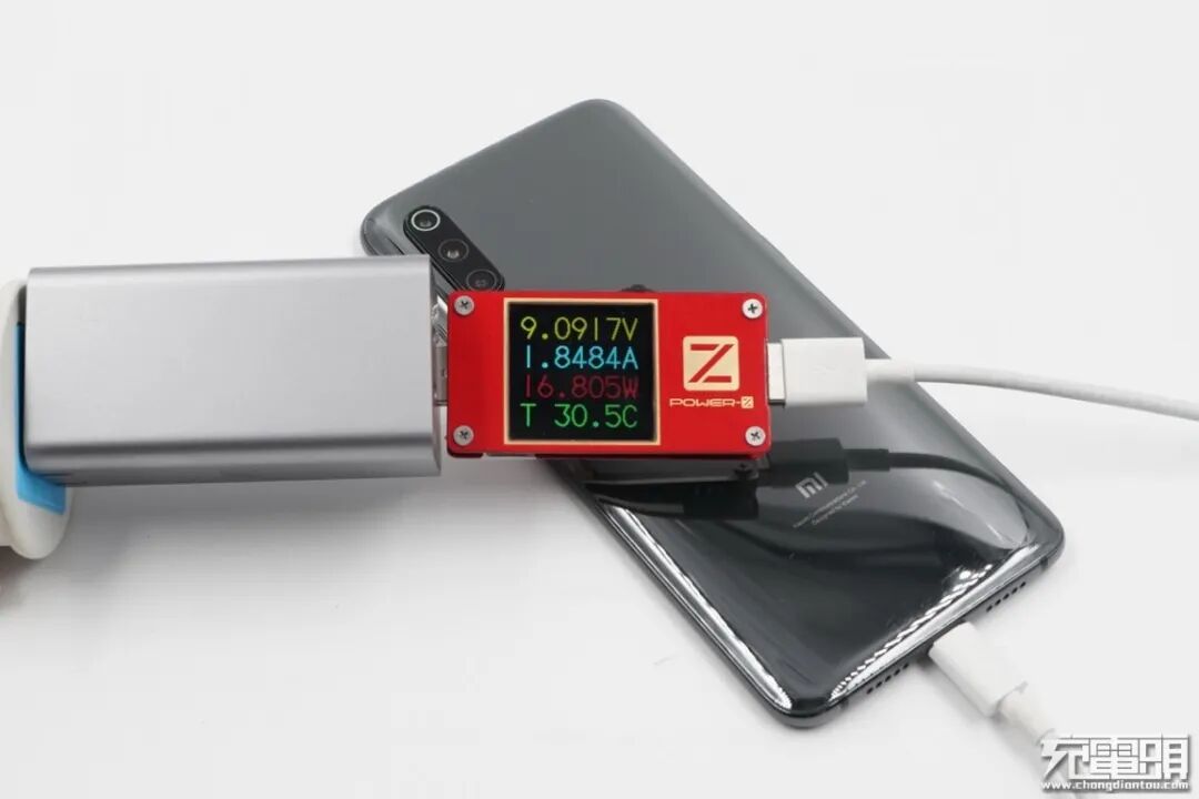 小米9支持USB PD / QC / 27W ChargeTurbo快速充电协议,使用USB-A为小米9充电,功率为9.09V 1.84A 16.8W,成功握手QC快充,并达到QC快充功率最大阶段。
