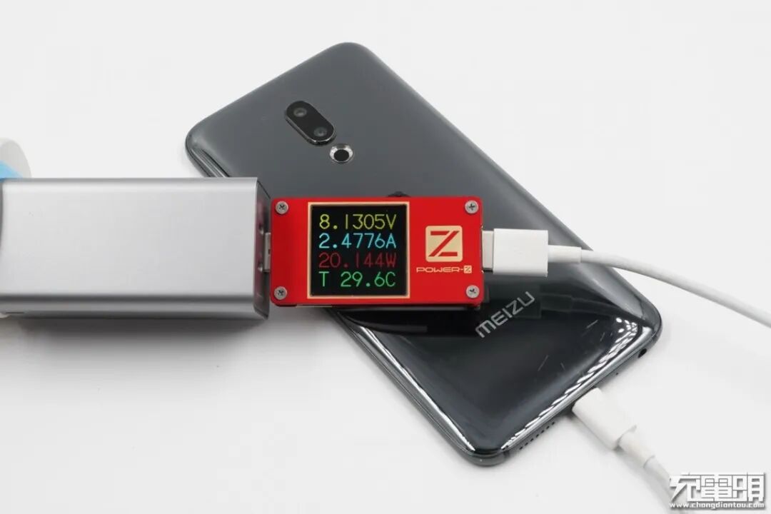 魅族16th Plus只支持PE快速充电协议,使用USB-C2为魅族16th Plus充电,功率为8.14V 2.55A 20.82W,成功握手PE快充,并达到PE快充功率最大阶段。