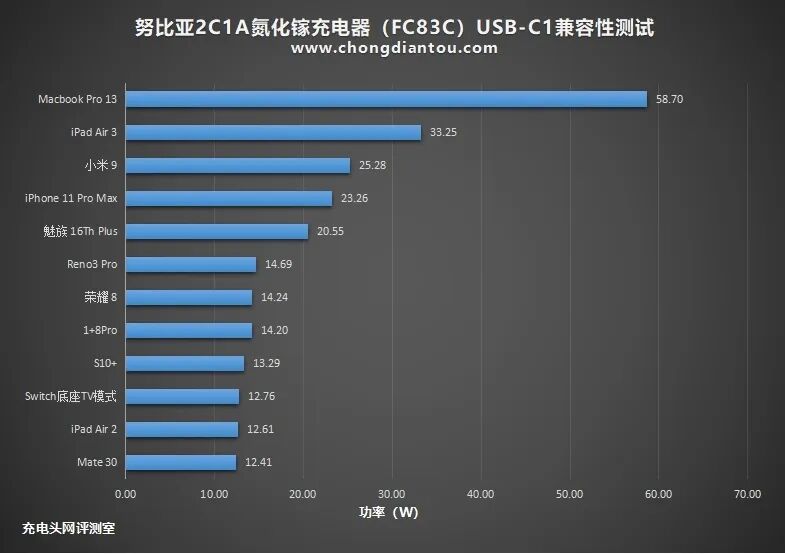 功率数据制作成柱状图,对macbook Pro 13笔记本充电功率达到58W,对iPad Air3充电功率达到33W,可以看出努比亚USB-C1支持大功率设备充电并达到满载。小米9握手PPS快充功率达到25W,iPhone 11 Pro Max握手PD快充功率达到23W,魅族16th Plus握手PE快充功率达到20W。其他设备功率在12~14W在之间。