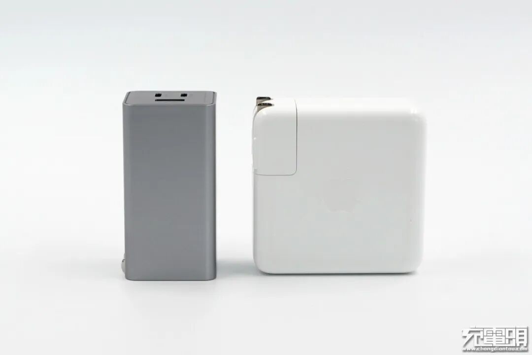 两款产品并排站立对比,努比亚65W氮化镓充电器功率密度0.64W / cm³,苹果61W单口充电器功率密度0.38W / cm³,大小差距一目了然。