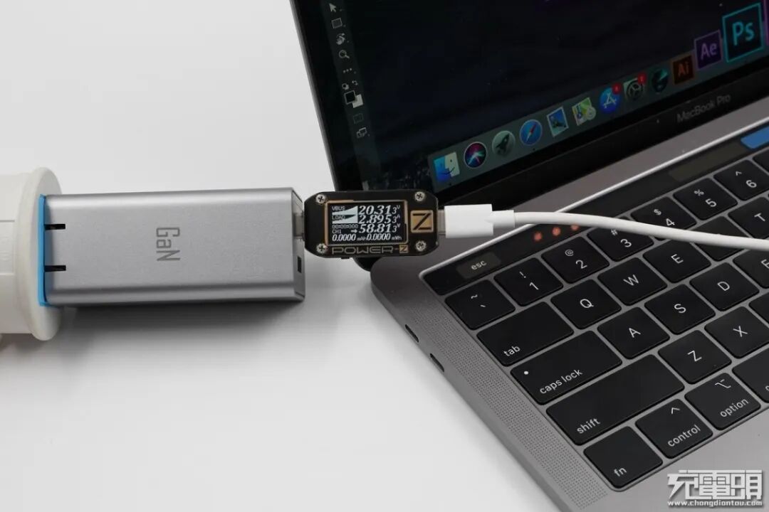 Macbook Pro 13支持60W USB PD快速充电,使用USB-C1为Macbook Pro 13充电,功率为20.31V 2.89A 58.81W,成功握手USB PD快充,并达到PD快充功率最大阶段。
