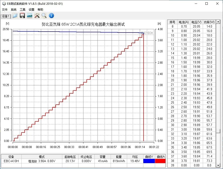 使用EB程控电子负载仪测试努比亚2C1A氮化镓充电器最大输出性能,将USB-C1输出诱骗至20V,以0.1A为电流步进单位,10秒为时间间隔,测试录的最大输出功率为19.81V 3.7A 73.3W,最大输出功率比额定功率多12.7%余量。