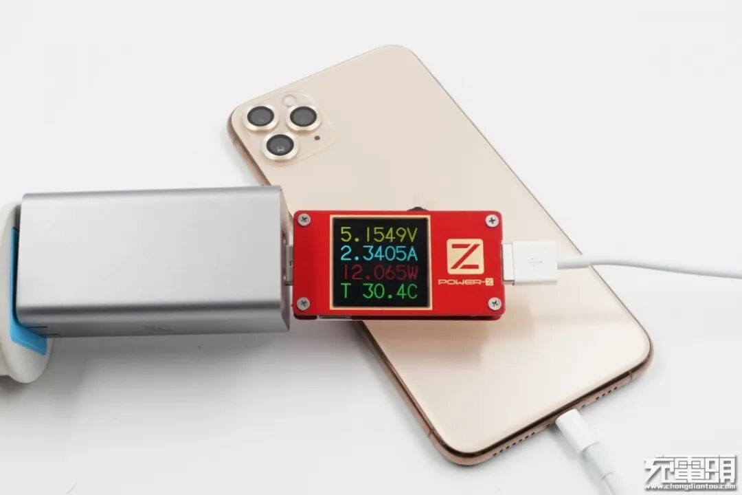 iPhone11 Pro Max 支持USB PD和Apple2.4A快速充电协议,使用USB-A为iPhone11 Pro Max充电,功率为5.15V 2.34A 12.06W,成功握手Apple2.4A快充,并达到Apple2.4A快充功率最大阶段。