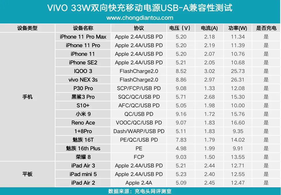 将测试的数据放在表格当中,从数据上来,两款vivo自家的手机充电功率最高,成功握手FlashCharge闪充,大多数支持QC快充的安卓手机也成功握手QC快充,华为手机也成功握手FCP快充协议,开启快速充电模式。