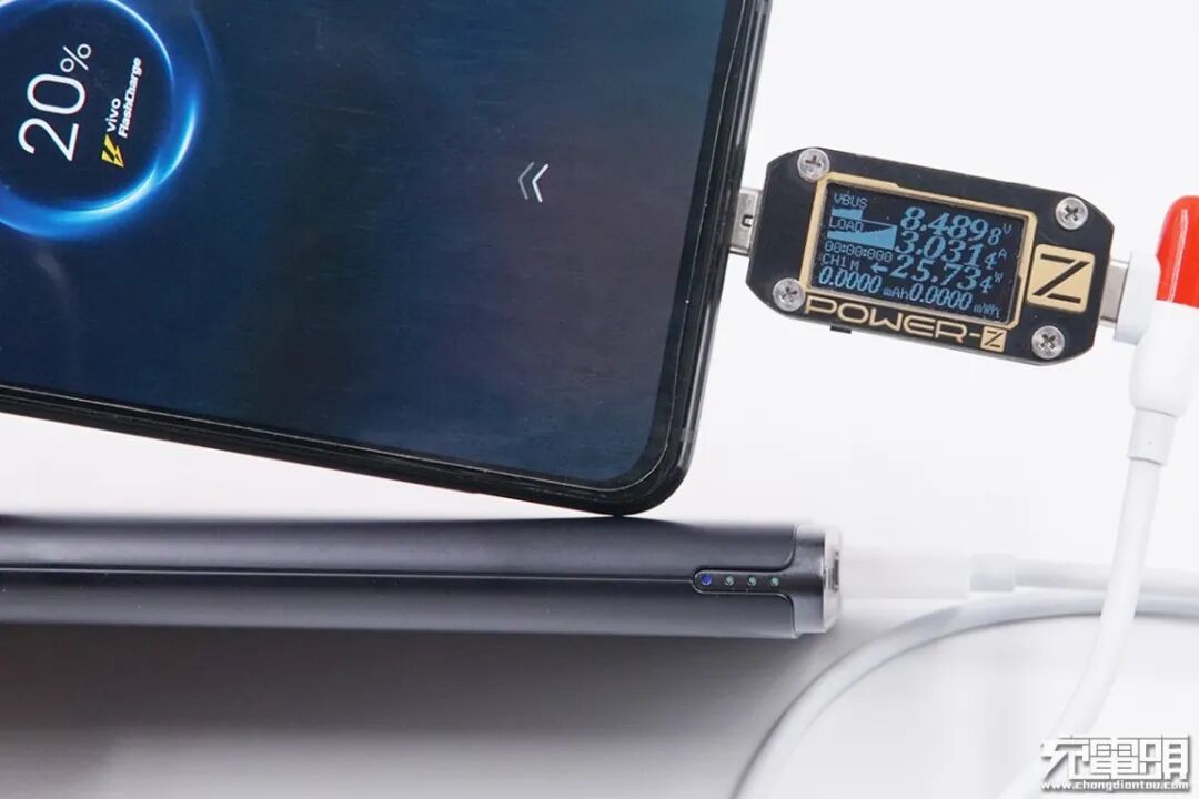 移动电源支持MicroUSB和USB-C两种输入方式,实测均可以快充输入,并且使用vivo自家的充电器为移动电源充电可以获得22W以上的输入功率,多种快充方式可供用户选择。