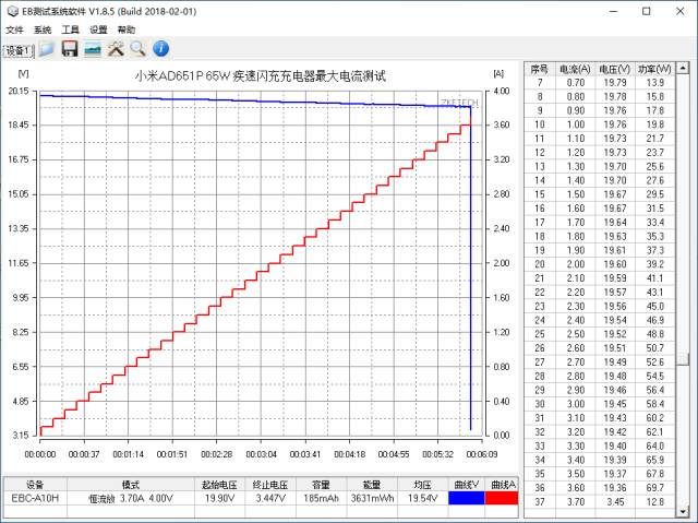 使用EB程控电子负载测试小米Type-C充电器65W疾速闪充版最大输出功率,以0.1A为电流步进幅度,10秒为时间间隔,最终录得最大输出为19.36V 3.7A 69.7W,额外的功率余量为7.2%。