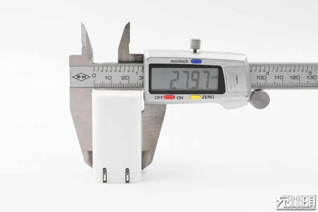 厚度约为27.97mm。由充电器的长宽高参数可以得到充电器的体积为69.9668cm³,所有充电器的功率密度为0.92W/cm³,和不久前推出的65W充电器功率密度相同。
