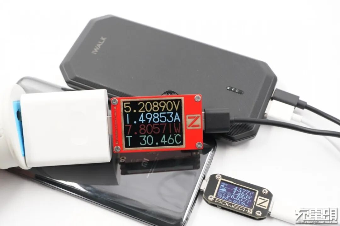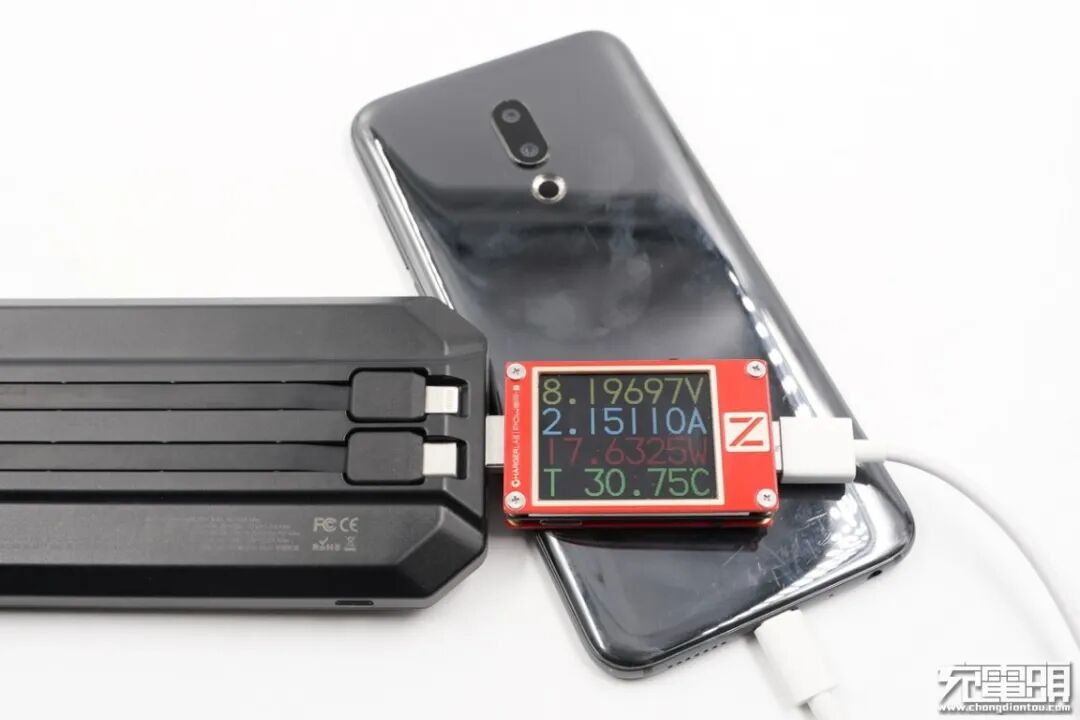 对移动电的边充边放进行测试,通过USB-C为移动电源充电,功率为7.80W,同时使用USB-A为小米9充电,功率为6.83W,移动电源支持边充边放。