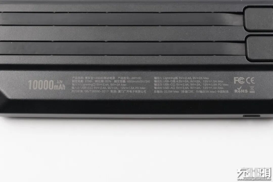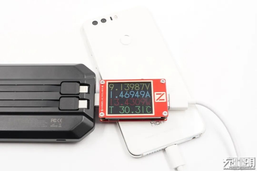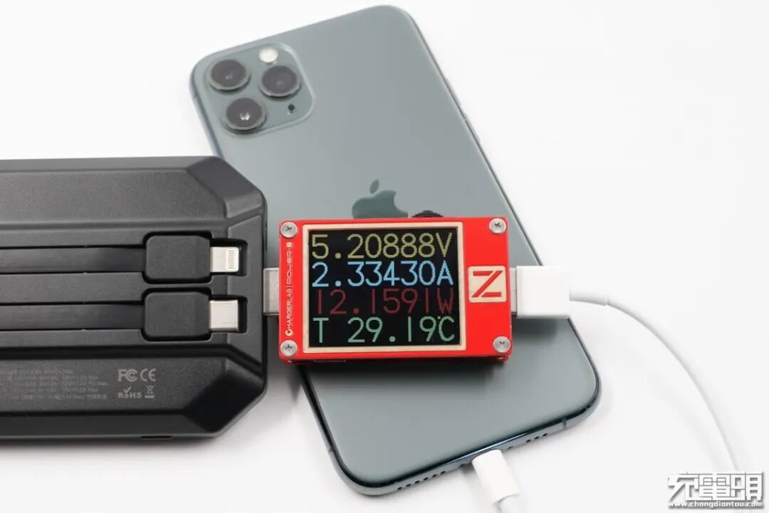 移动电源最大的特色在于自带了Lightning和USB-C的快充线,兼顾了苹果和安卓用户,接口配置方面自带了USB-C双向快充接口,USB-A输出接口以及Lightning输入接口,支持PD、Apple2.4A、QC2.0、QC3.0、AFC、FCP、SCP以及PE等快充协议,在实际的兼容性测试均可以很好的握手快充。值得一提的是自带的USB-C接头的数据线为华为P30 Pro充电也可以握手SCP快充,手持华为手机充电用户可以关注一下。