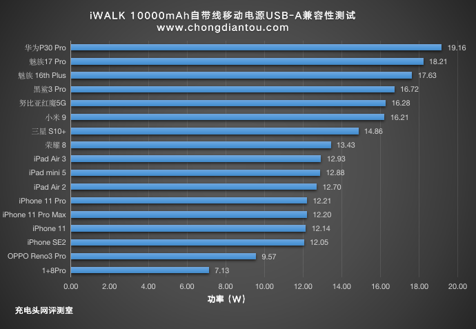 将USB-A测试的数据放在柱状图当中,华为P30 Pro成功握手SCP快充, 功率达到了19.16W,魅族16th Plus成功握手PE快充,功率达到了17.63W,其他安卓手机成功握手QC快充,充电功率在14W-19W之间,苹果设备成功握手Apple2.4A快充,功率在12W-13W之间。