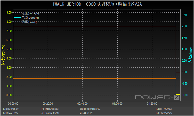 2、18W最后对移动电源以9V 2A档位进行输出效率测试,测试全程均握手9V 2A输出档位,期间电压、电流以功率三大数据平台均持稳定输出状态,全程耗时约1小时33分。放出的能量约为28.2684Wh,所以移动电源在以9V 2A档位输出时效率约为28.2684/37=76.40%。