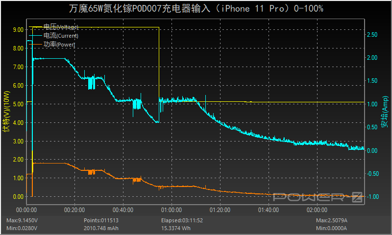 为MacBook Pro充电,开始充电时功率已经到达了45W的功率档位,大功率输入持续了约50分钟,期间电流出现了一处小波动,随后电流和功率开始逐渐下降直至充电结束。为iPhone 11 Pro充电,开始时便握手了9V的PD电压档位,18W的充电功率持续了约16分钟,随后功率和电流开始出现阶梯式的下降状态,约54分时,电压将至5V,开始进入普通充电模式,三大数据平台持续了约15分后功率和电流开始逐渐下降直至充电结束。