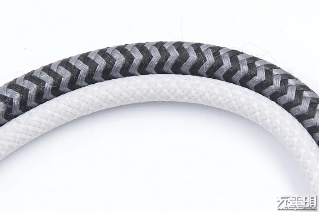 虽然线身整体包裹的非常紧密,但是一个满是毛刺的编织线在视觉上还是很尴尬的。而上面这条可能会是iPhone 12原装的编织线则采用了不同的编织方式,灰白相间的两股细丝通过加捻后以2+2交错的方式进行混编,这样做的好处就是相比起常见的TPE外皮抗磨损能力更好。
