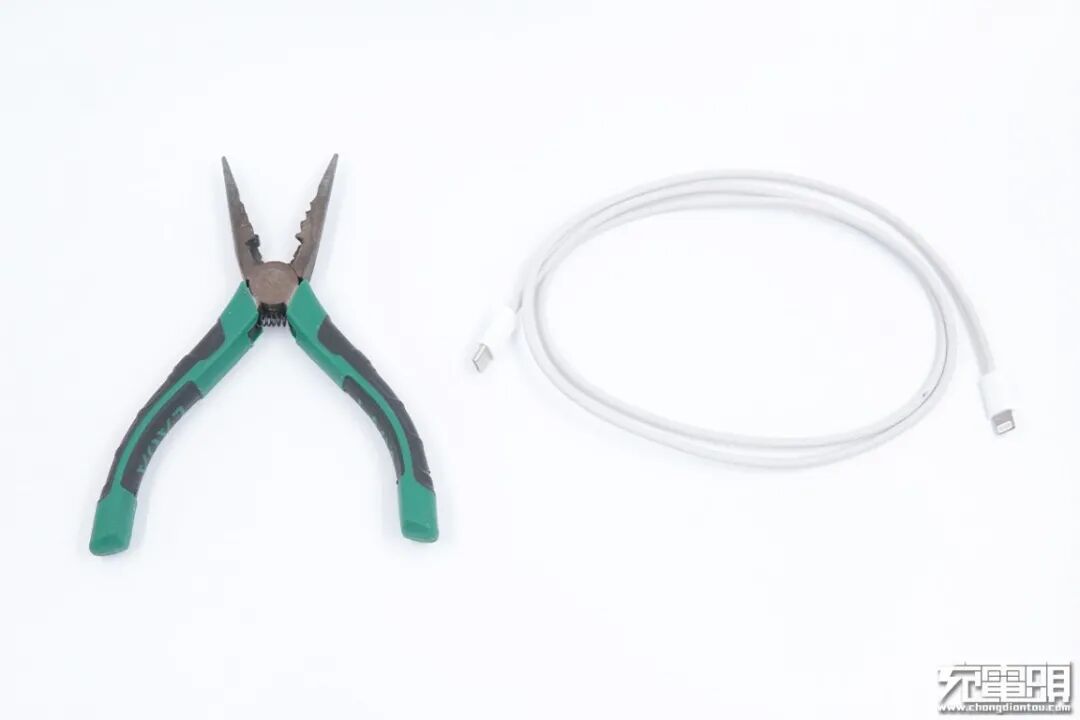 小编找来尖嘴钳来模拟日常的使用磨损的过程,首先来看一下苹果TPE线身材质原装线的抗磨损情况。