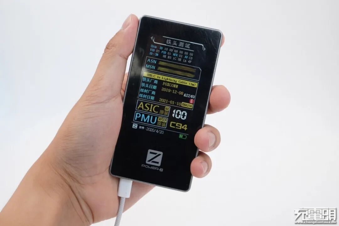 原装线自然不用多说,使用ChargerLAB Power-Z MF001测试仪对数据线进行Lightning端子检测,测得ASIC、PMU均为原装,评分为100分。