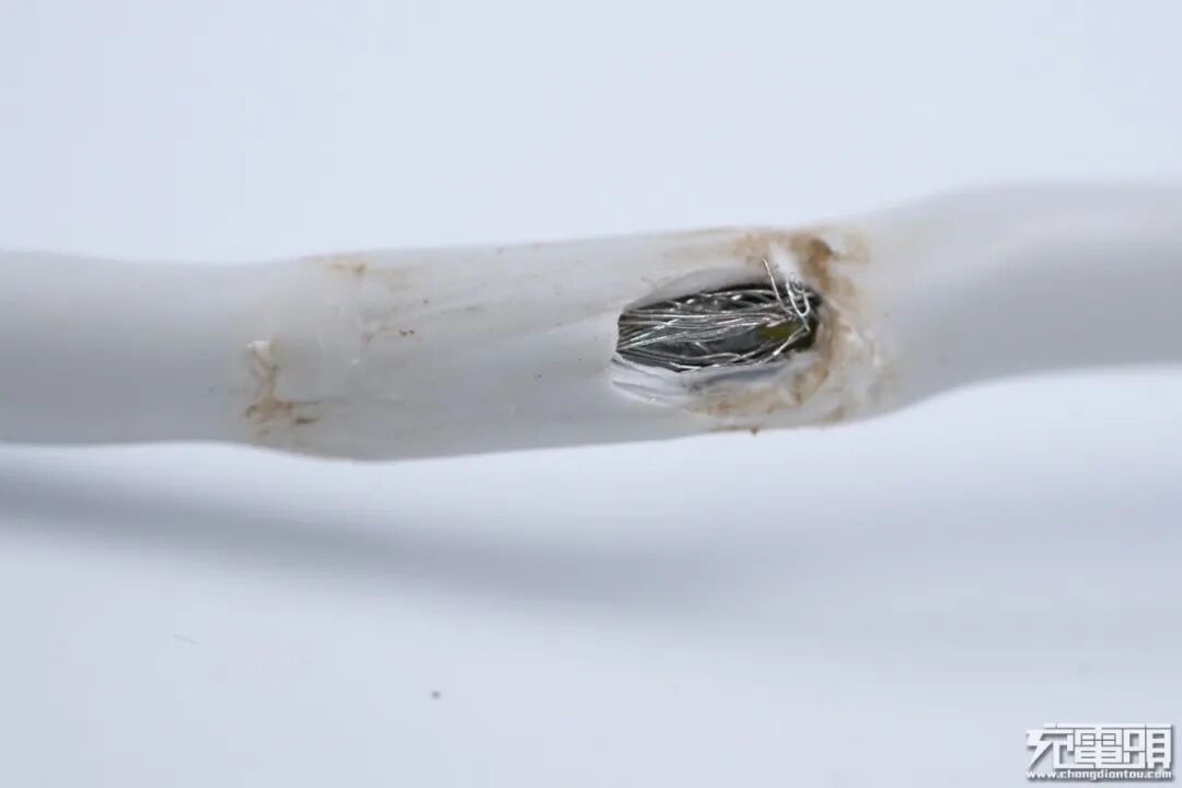 线材质量差主要体现在出现折弯、折断、表皮破裂等现象,这是因为在日常生活的使用当中不断磨损之后产品的现象,为了测试线材的抗磨损的情况,小编直接将线材置于极限状态下进行测试。