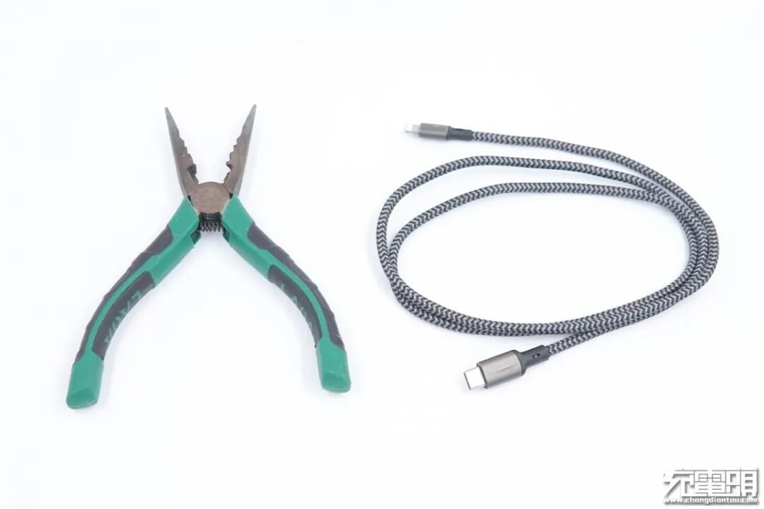 在实际的测试过程中可以明显感知到线材很粗,但是依旧要使用尖嘴钳来对线材进行模拟“磨损”测试。
