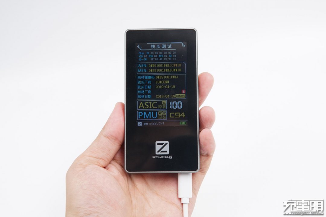使用ChargerLAB Power-Z MF001测试仪对今天的主角编织快充数据线进行Lightning端子检测,测得ASIC、PMU均为原装,评分为100分。