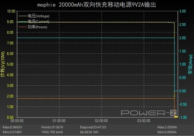 最后以9V 2A输出档位对充电宝进行输出效率测试,测试全程三大数据平台均持稳定的输出状态,全程耗时约3小时47分。放出的能量约为66.6836Wh,所以充电宝在以9V 2A档位输出时效率约为66.6836/74=90.11% 。