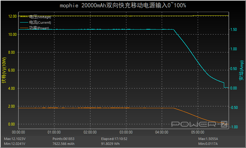 六、输入测试对充电宝的输入全程进行测试,测试开始时便握手12V 1.5A快充输入档位,约4小时18分前三大数据平台均持稳定的输入状态,全程耗时约5小时44分,最高功率为12.03V 1.05A 18.02W。