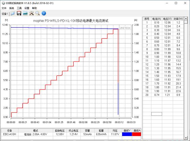 十二、最大输出功率使用EB程控电子负载测试mophie 10000mAh无线充充电宝的最大输出功率,以0.1A为电流步进幅度,10秒为时间间隔,最终录得最大输出为11.91V 1.90A 22.6W,额外的功率余量为25.55% 。