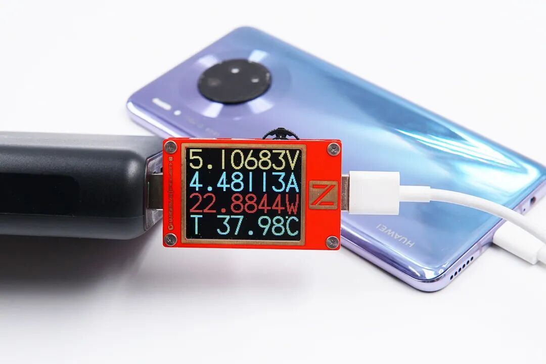 华为 Mate30 支持SCP、FCP和 USB PD快速充电协议,使用USB-C为华为 Mate30充电,功率为5.10V 4.48A 22.88W。