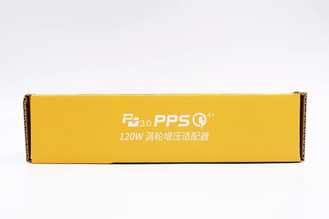 侧面则为纯黄背景,最吸睛的是“120W涡轮增压适配器”,看来充电器行业也要向汽车行业学习。我们认为甭管什么增压,用户体验才是王道,后面我们会进行测试分析。