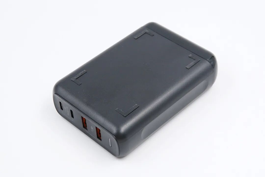鸿达电源出品的这款120W充电器呈长方体,体积不小,孔位挺多,整体为黑色,厚实稳重。它拥有最大120W功率输出,两个USB-C接口和两个USB-A接口,支持笔记本、平板、手机、手表手环、TWS耳机等设备充电,一个充电器就可以兼顾多设备同时使用十分灵活。