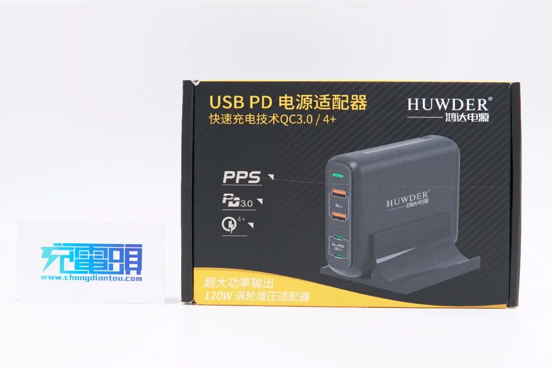 鸿达电源出品的这款120W充电器呈长方体,体积不小,孔位挺多,初看并不像充电器,倒是像小编桌子上的拓展坞。