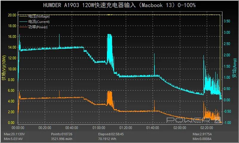 为MacBook Pro 13充电,经过短暂开机,功率到达了 20V 2.25A 45W的功率档位,大功率输入持续了约47分钟,随后电流和功率开始阶梯式下降直至充电结束,中间出现过几次大的波动,尤其是1小时10分到30分中这二十分钟电流和功率上升波动较大,最高功率为20.04V 2.91A 58.48W。