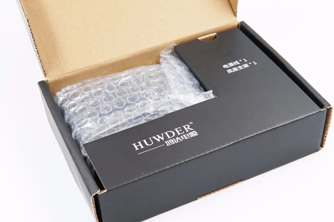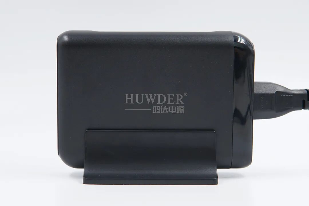 充电器整体以黑色为主,外壳由微磨砂黑与亮黑拼接而成,侧面中心印有“HUWDER鸿达电源”,表明品牌归属。一种使用形态是放在包装附赠的底座上,可以使充电器立起来,显得更加整洁。