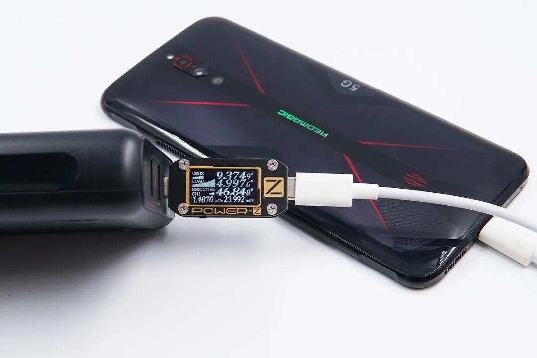 努比亚红魔5G手机支持PPS、QC和USB PD快速充电协议,使用USB-C对努比亚红魔5G手机充电,功率为9.37V 4.99A 46.84W。