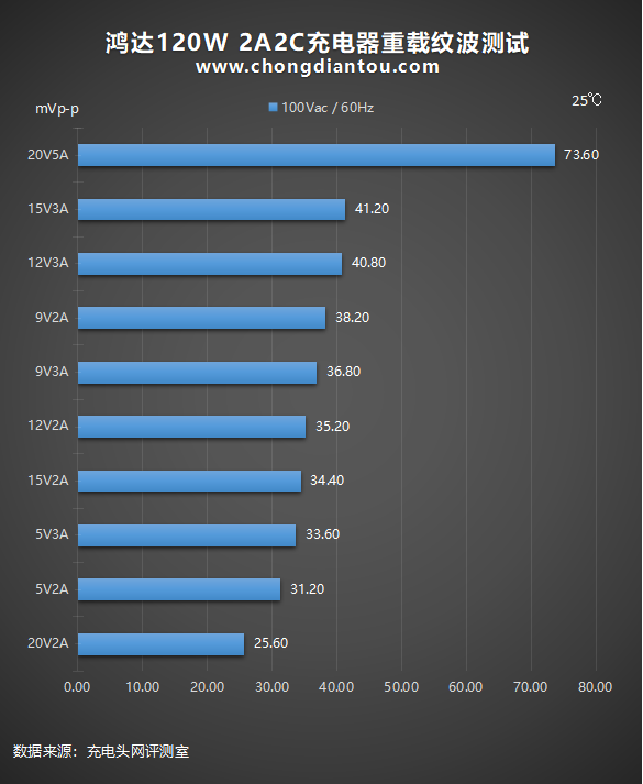 国家标准中充电器纹波要求是不高于200mV,鸿达120W 2A2C充电器在110V 60Hz、240V 50Hz输入电压下,所有输出功率纹波峰峰值均低于200mV这个标准很多,表现不错。