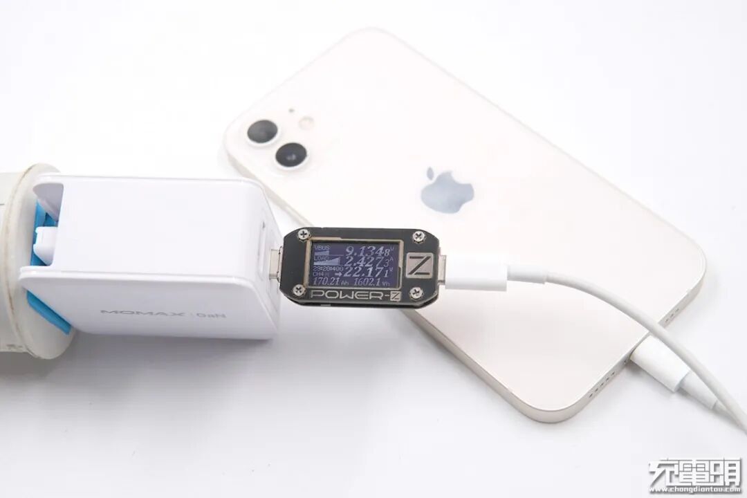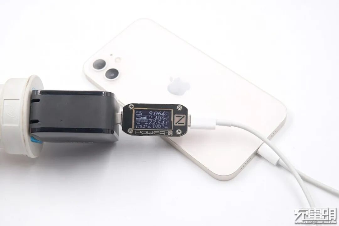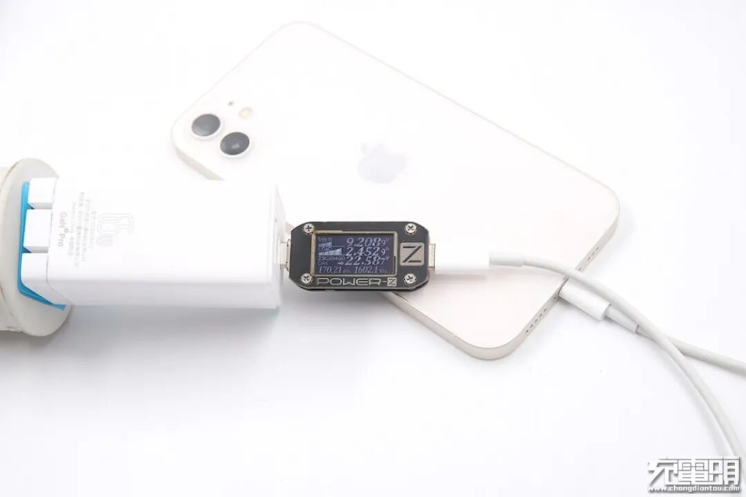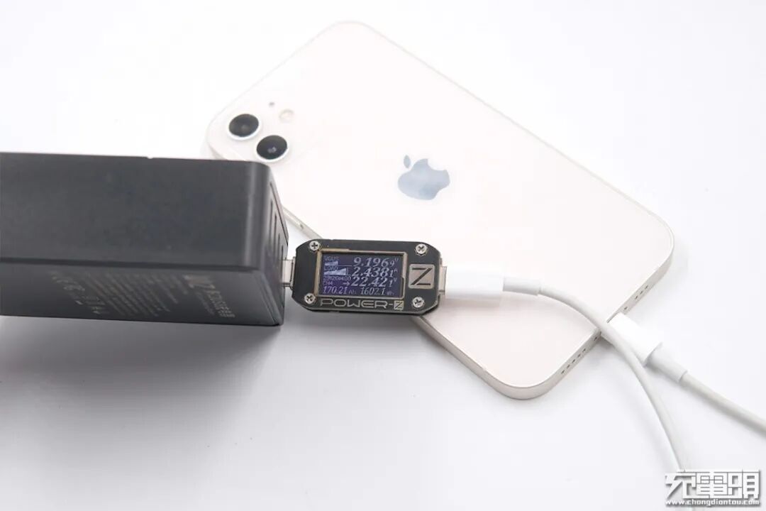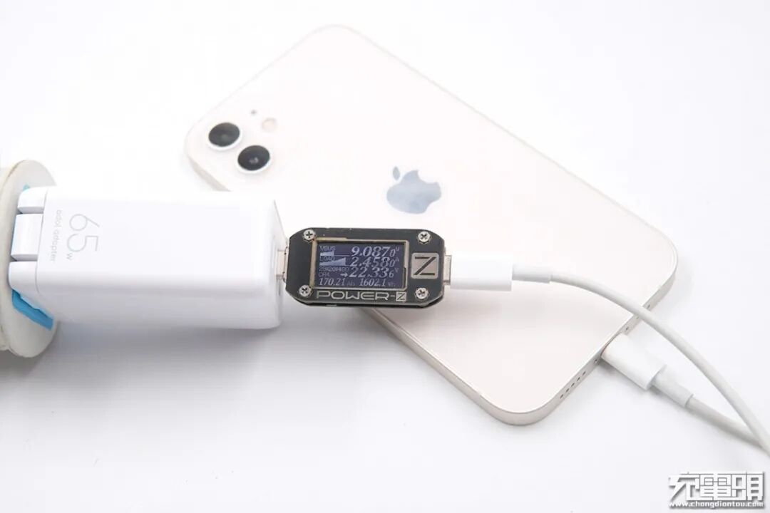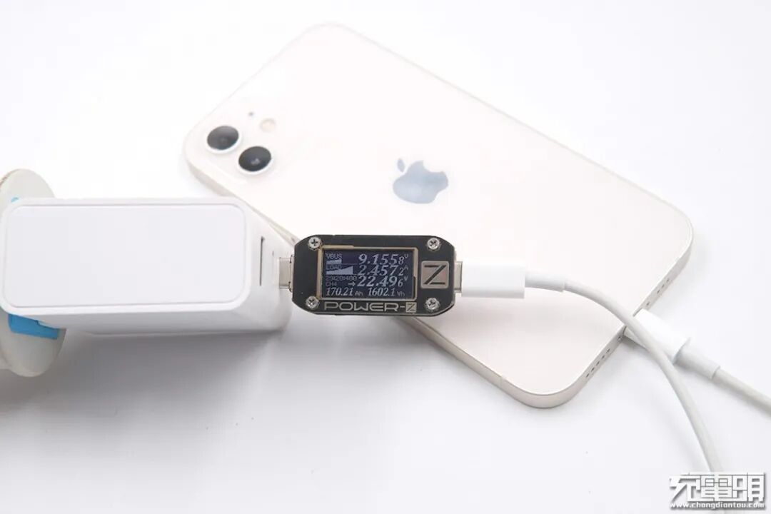 使用ZMI紫米65W PD HA832充电器为iPhone 12充电,电压9.02V,电流2.30A,功率20.84W。