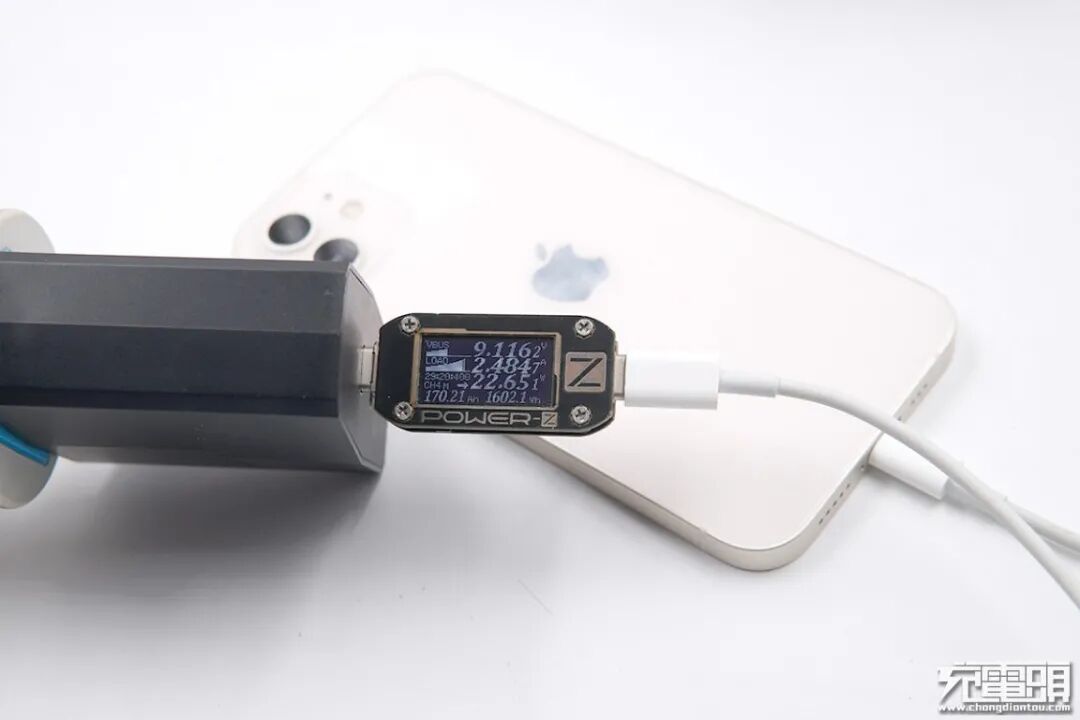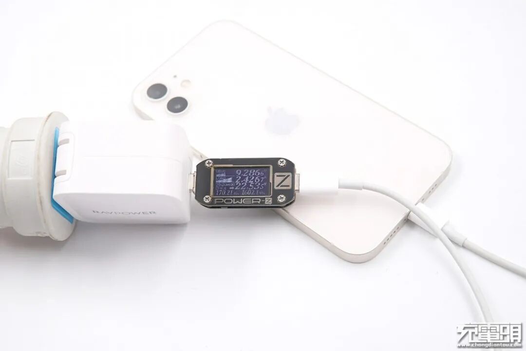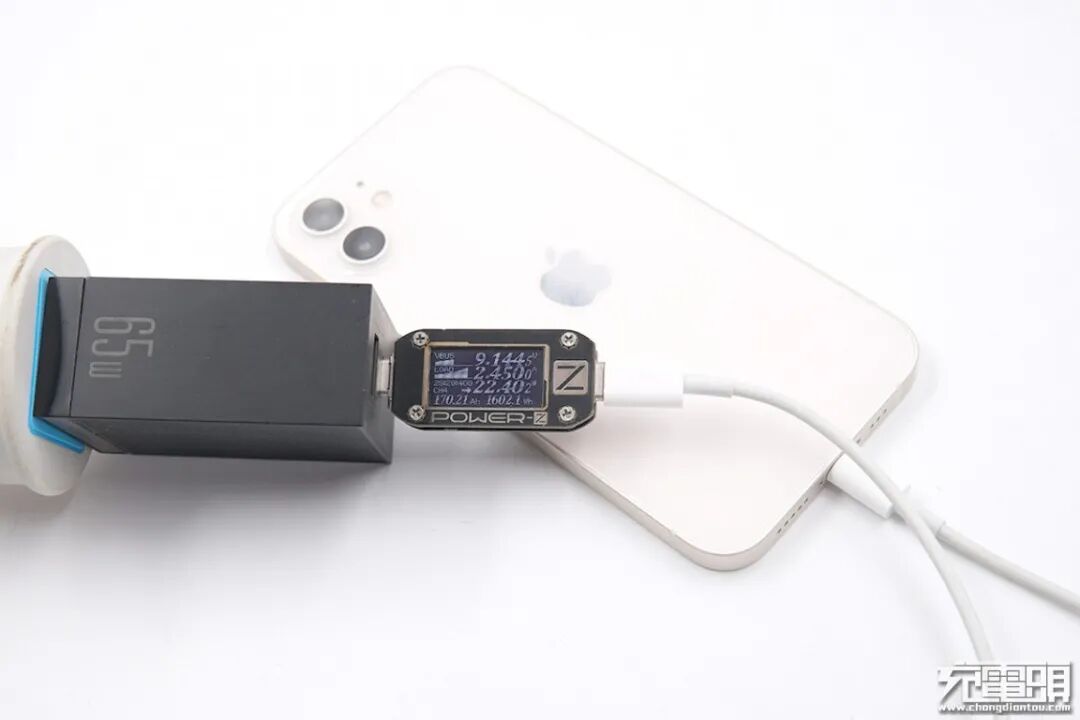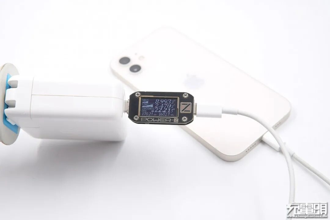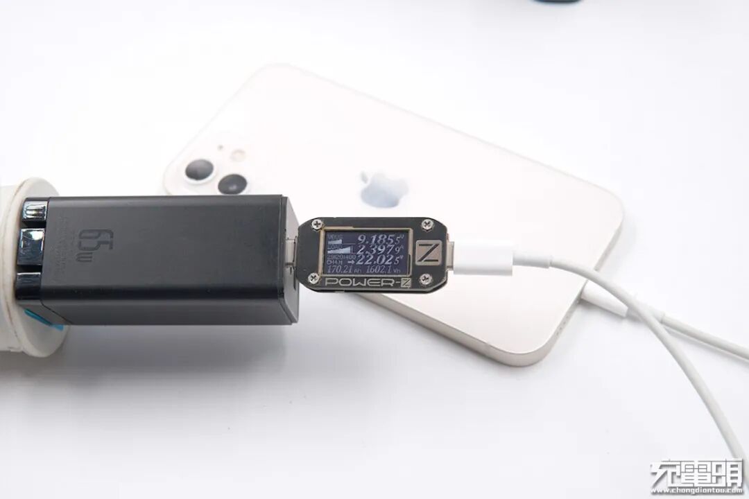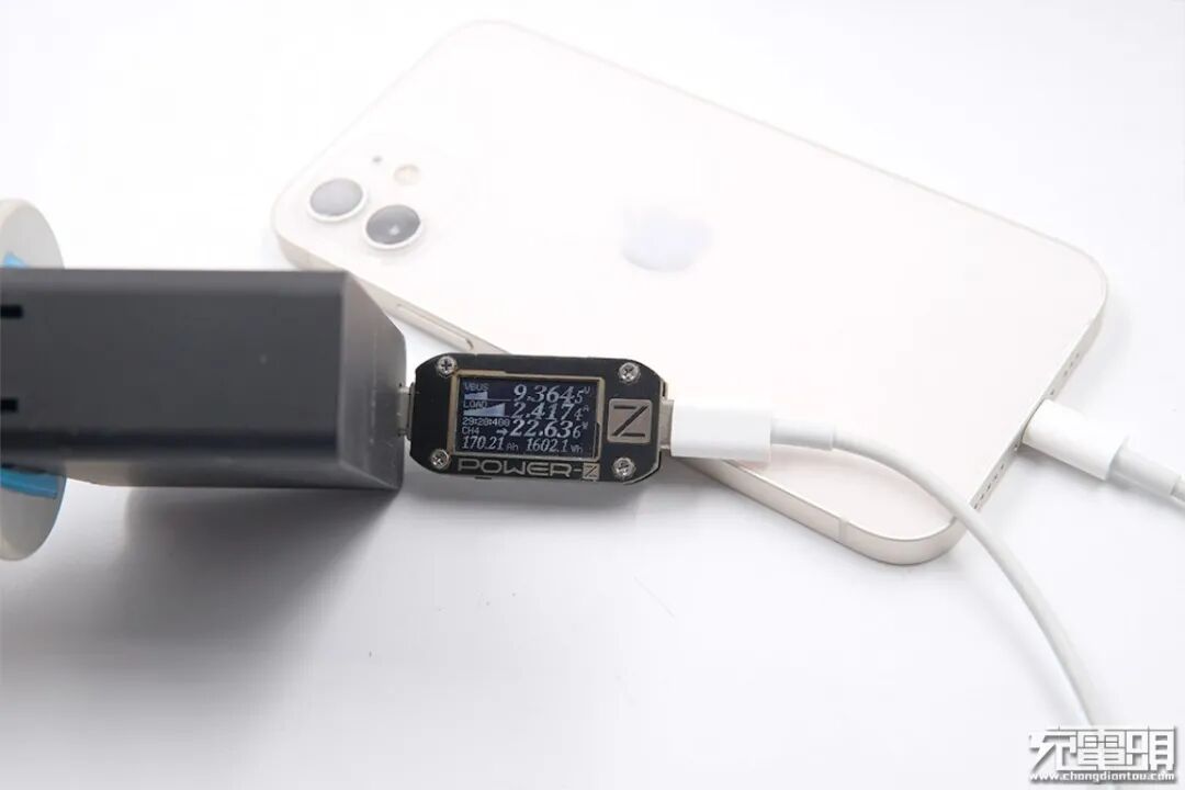 使用ZMI紫米65W PD HA932充电器为iPhone 12充电,电压8.98V,电流2.47A,功率22.20W。