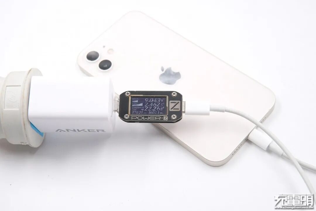 使用Anker安克65W PD A2029充电器为iPhone 12充电,电压9.03V,电流2.43A,功率21.96W。
