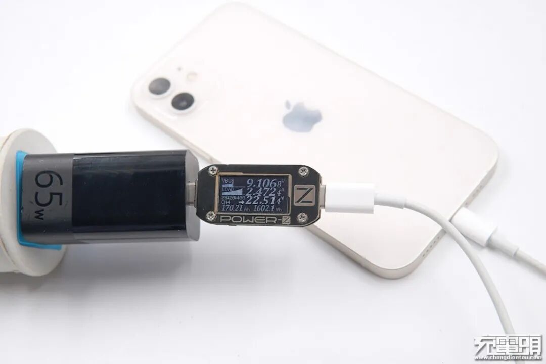使用ZMI紫米65W PD HA718充电器为iPhone 12充电,电压9.10V,电流2.47A,功率22.51W。
